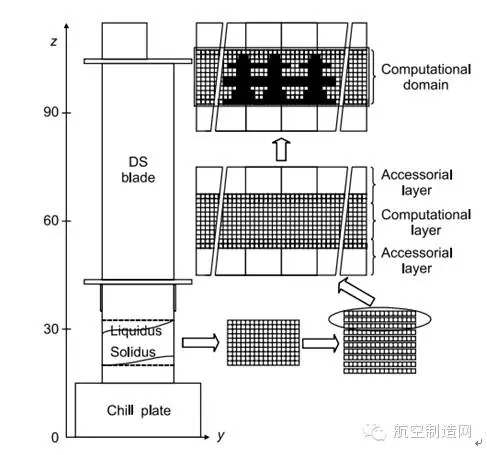 定向凝固技術(shù)。該技術(shù)的發(fā)展使鑄造高溫合金承溫能力大幅度提高從承溫能力最高的等軸晶合金到最高的第三代單晶合金,其承溫能力約提高l50℃ 。圖15為定向凝固高溫合金加工過程中的計算層示意圖。