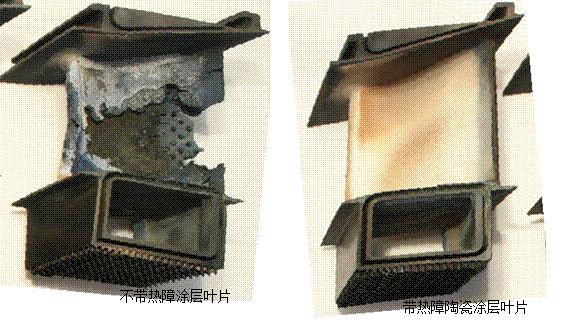 圖1 不帶陶瓷涂層葉片(左)和帶熱障陶瓷涂層葉片(右)服役后表面狀態(tài)對(duì)比